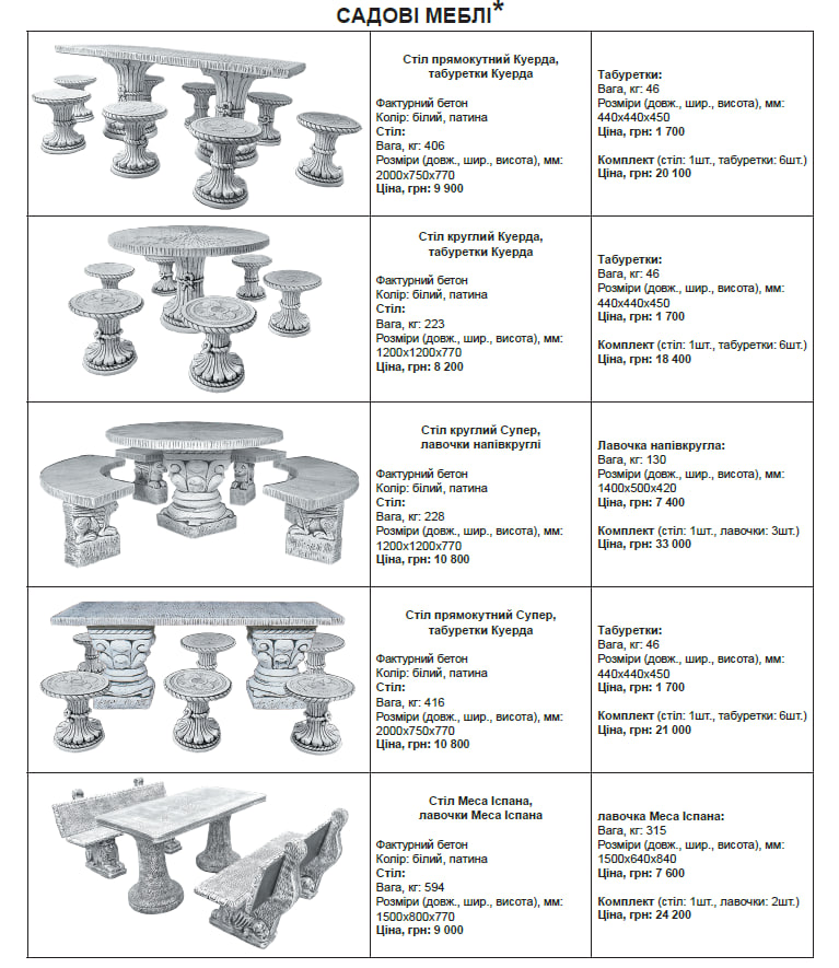 ЦІНА БЕТОННІ САДОВІ МЕБЛІ