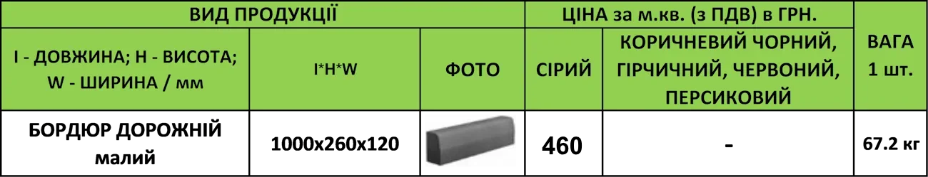 Бордюр тротуарний малий — це практичний та надійний елемент благоустрою, який відіграє важливу роль при укладанні майданчиків для проїзду легкових та середньовантажних автомобілів. Його основна функція — утримання дорожнього полотна та фіксація країв тротуарної плитки або асфальтового покриття. Вироби виготовляються з високоміцного бетону, що забезпечує тривалий термін експлуатації навіть за інтенсивного навантаження.