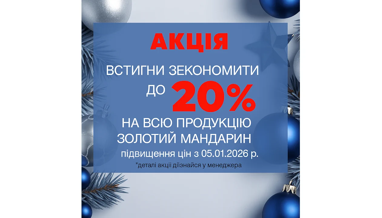 02 Дек Ежегодная зимняя акция — сэкономьте до 20% на продукции Золотой Мандарин! Зимняя акция – сэкономьте до 20% на продукции Золотой Мандарин! Дорогие наши Клиенты!В связи с официальным повышением цен на проду... Продолжить чтение