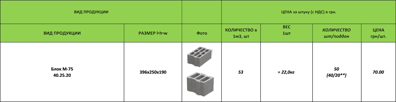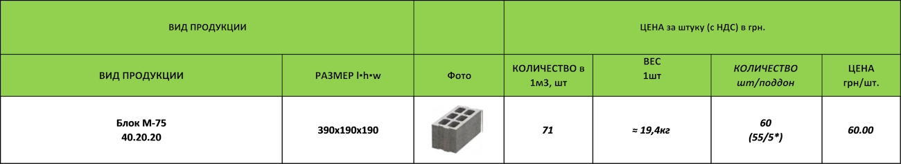 Блоки изготавливаются из высокопрочного бетона марки М75, что позволяет им выдерживать значительные нагрузки. Огнестойкость — первого класса, а также хорошая морозостойкость до 35 циклов делают эти блоки оптимальными для использования в условиях климата Украины.