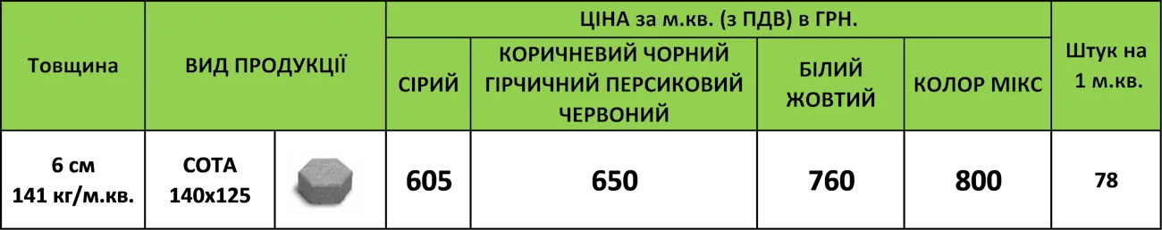 Плитка Сота має товщину 60 мм і призначена для зон із пішохідним навантаженням або рухом легкового транспорту. За умови правильного монтажу забезпечує довговічність, стабільність та естетичний вигляд навіть у зонах активного використання.